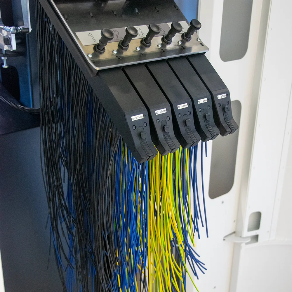 12 Drähten mit einem Querschnitt von 0,5 mm2 bis 6 mm² gleichzeitig ausgestattet werden und kann diese ohne Umrüsten bearbeiten. Um andere Drähte verarbeiten zu können, muss nur die Drahteinzugskassette ausgewechselt werden.