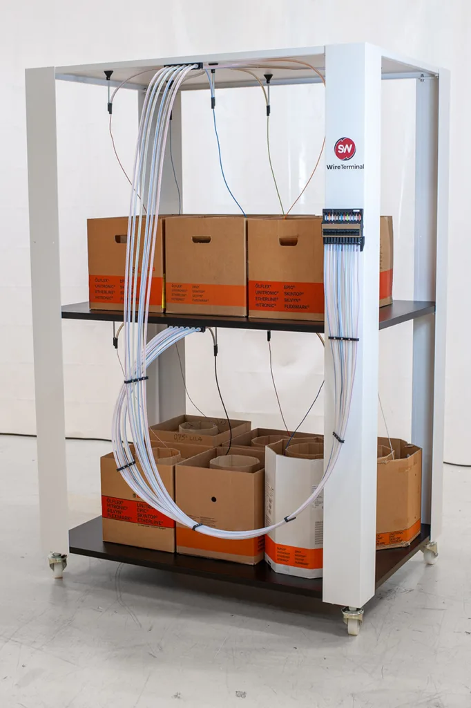 Die Drahtkassette kann über einen RFID-Chip eindeutig zugeordnet werden. Die gerüsteten Drähte vom WireStorage können am WireTerminal gespeichert werden, wodurch ein schnelles Umrüsten gegeben ist. Durch die Lagerung auf vier beweglichen Rollen kann das WireStorage leicht manipuliert werden.